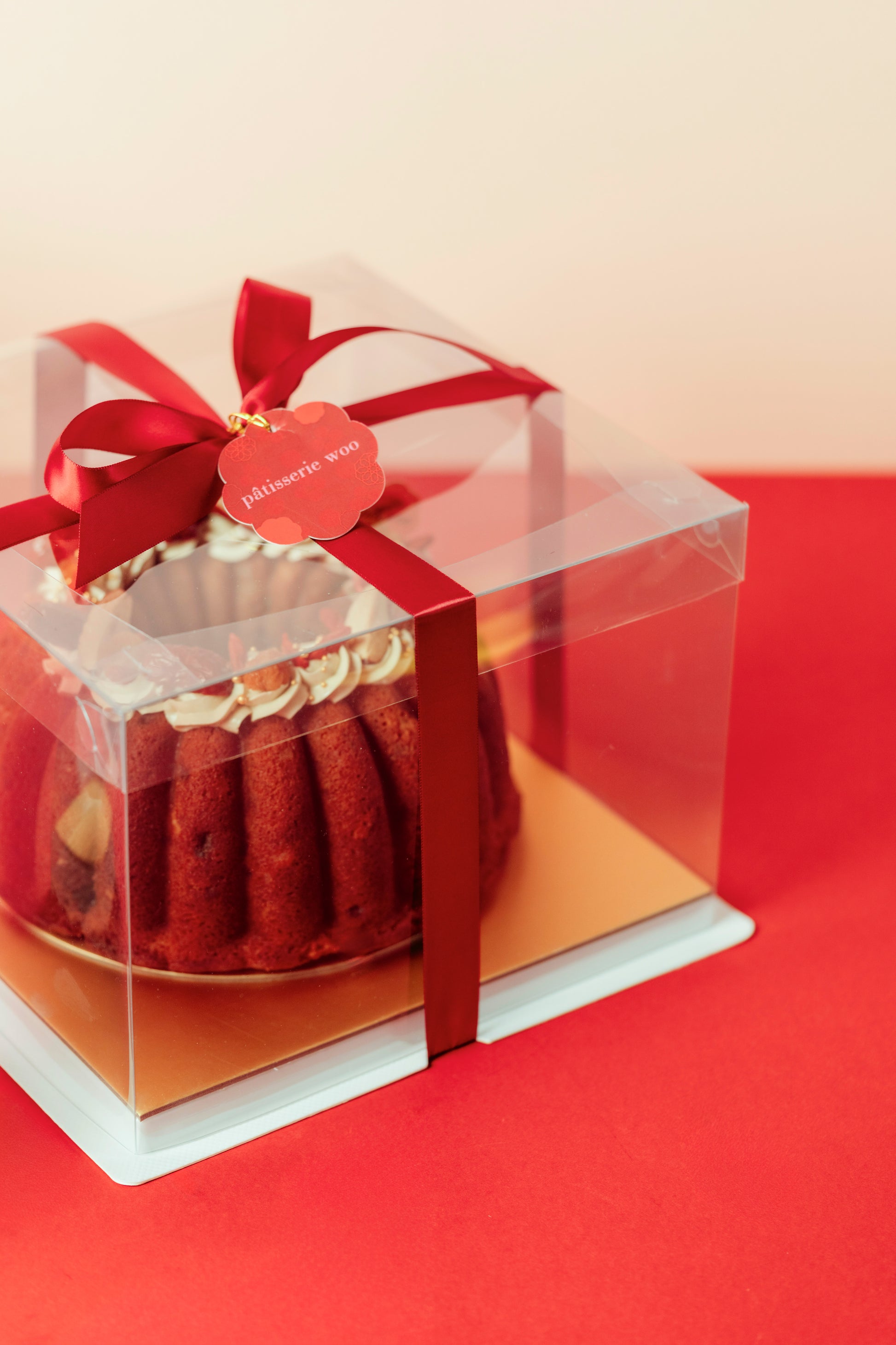 Bundts are individually packed in transparent plastic box and adorned with a red ribbon.