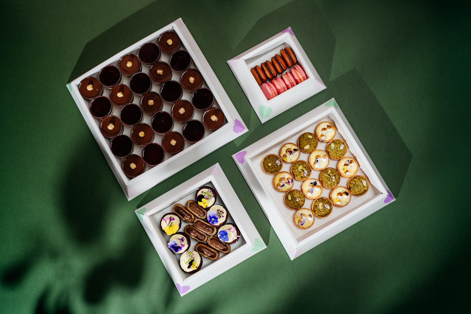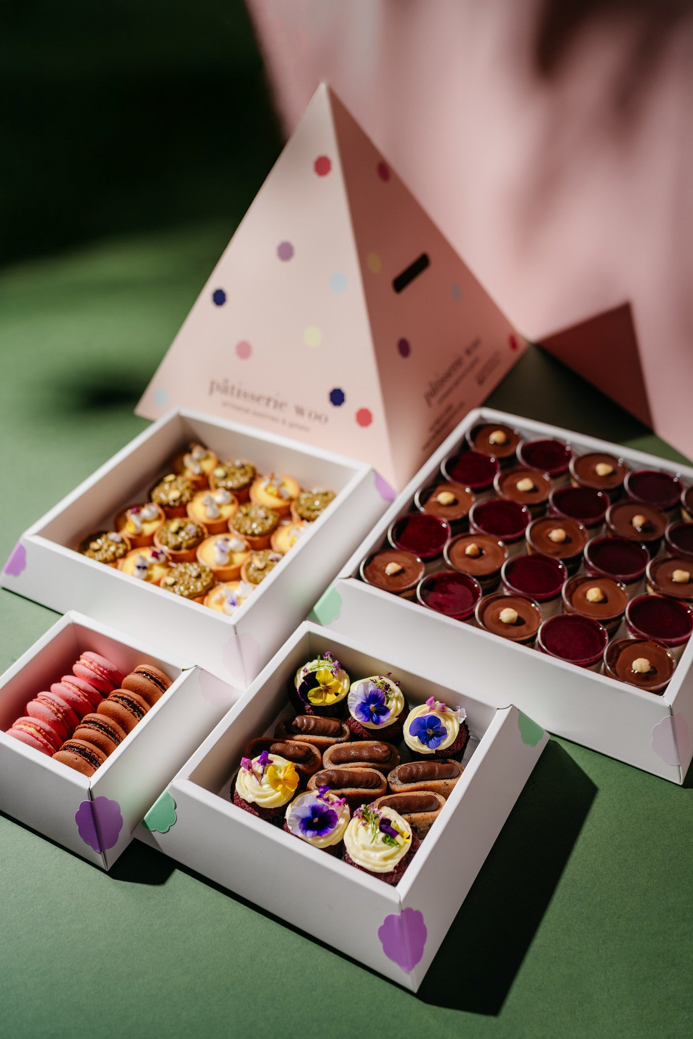 The ideal assembly of desserts to accompany any event, each laid delicately atop one another. Bringing together the best of Patisserie Woo is our dessert platter, where our intricate tarts meet decadent hazelnut parfaits that easily melt in your mouth. A curation that not only pleases both the eyes and appetite, but also effortlessly becomes the main event of your dining table, allowing your guests to experience artisanal desserts with unprecedented ease.